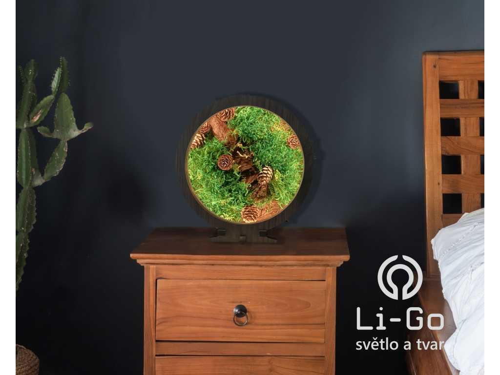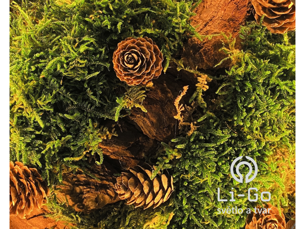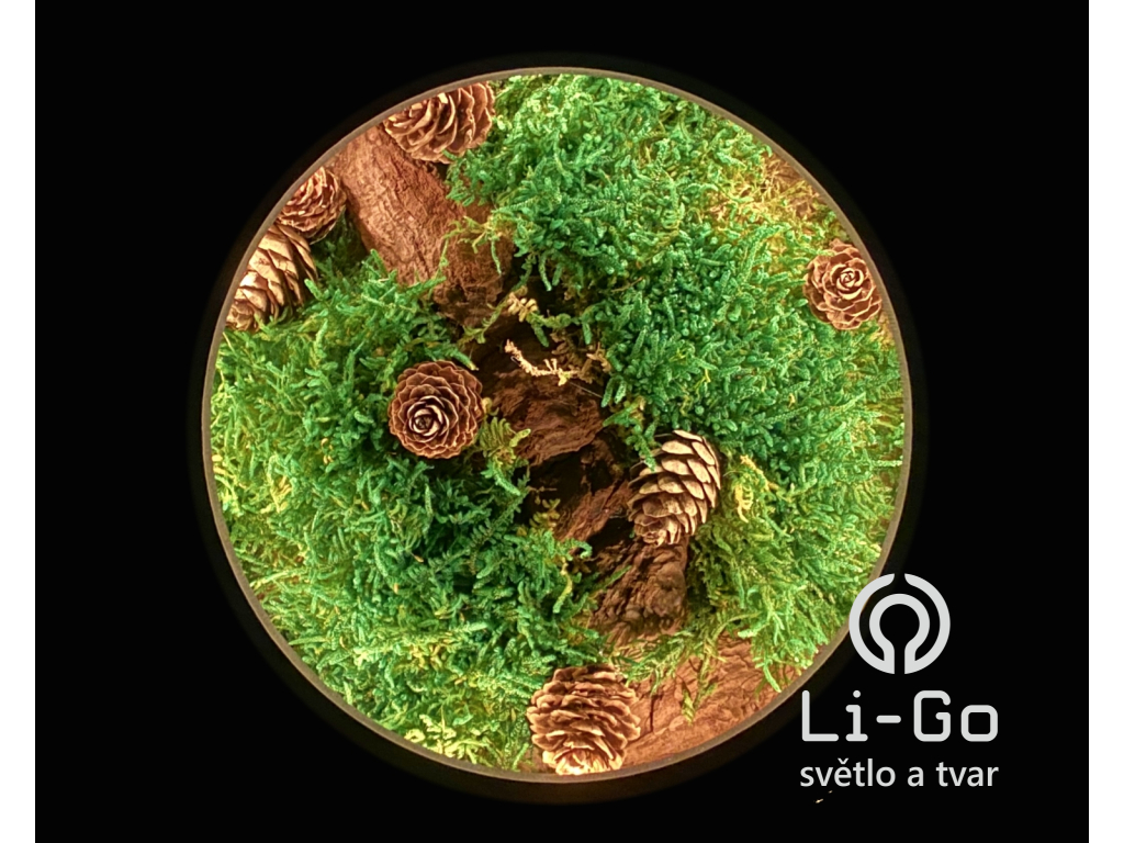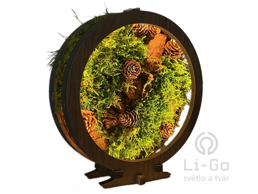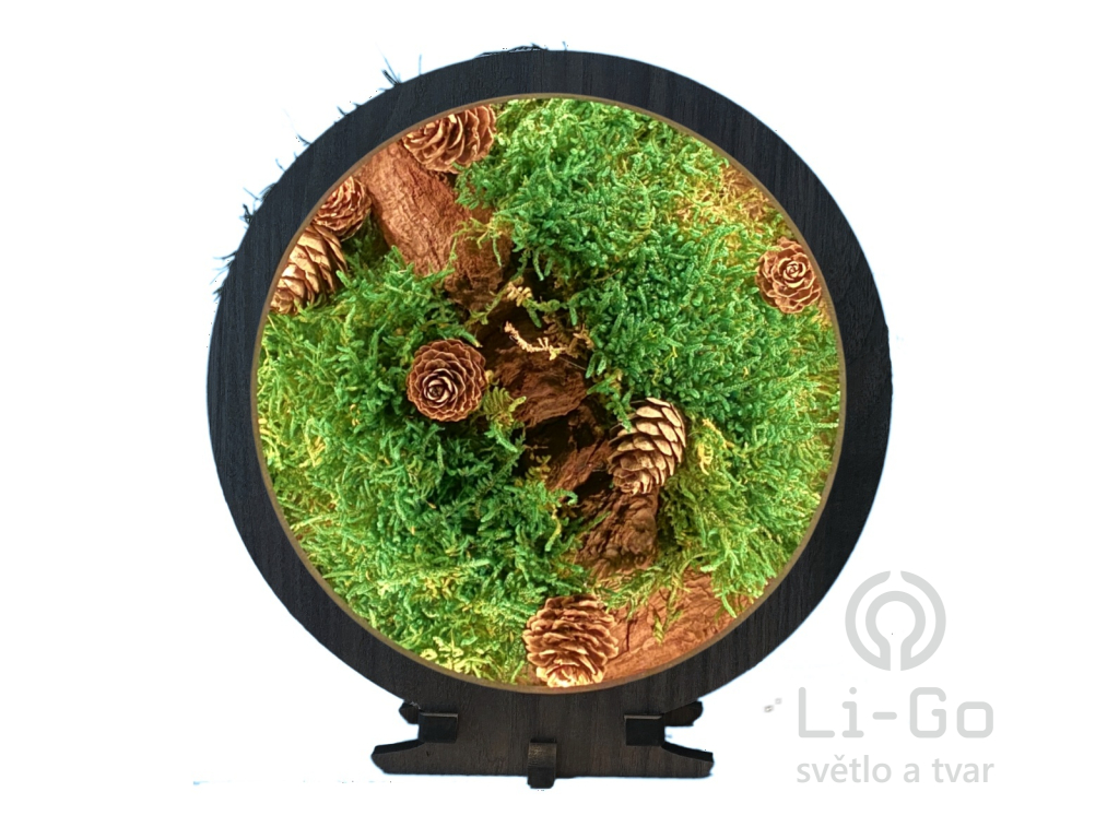 Obrazová LED lampa má podsvícenou vnitřní stěnu. Na lampu je přichycen mech, borová kůra a modřínové šišky. Lampa je osazena LED diodami a napájena externím zdrojem napětí na 12V do zásuvky. Součástí svítidla je otočný stmívač a zdroj.