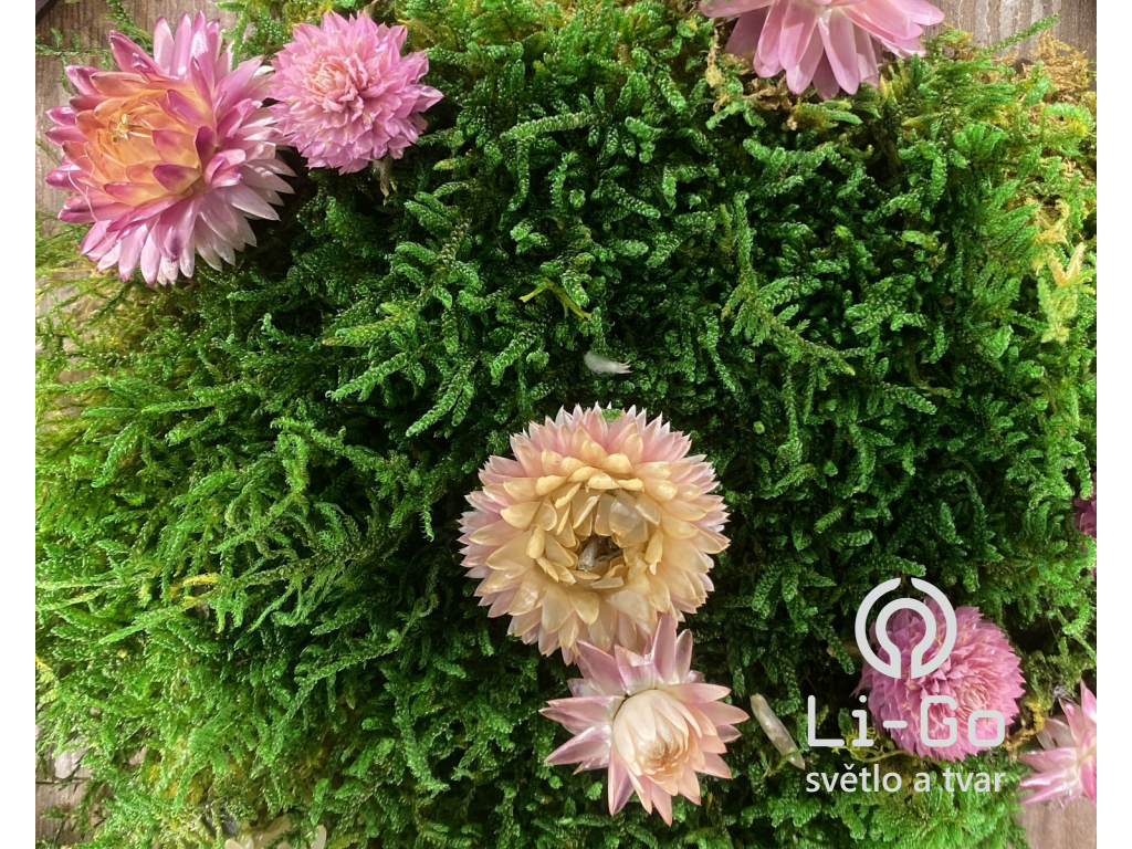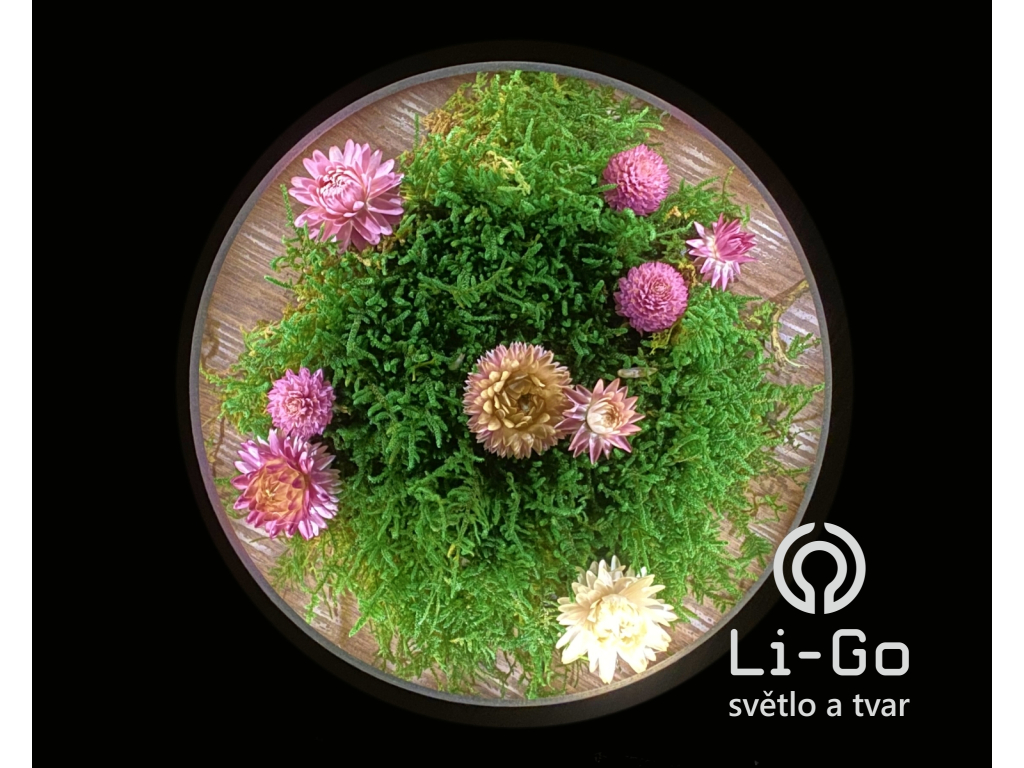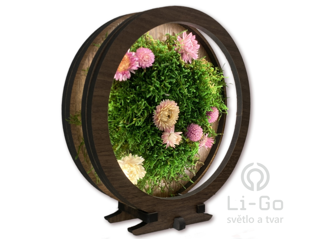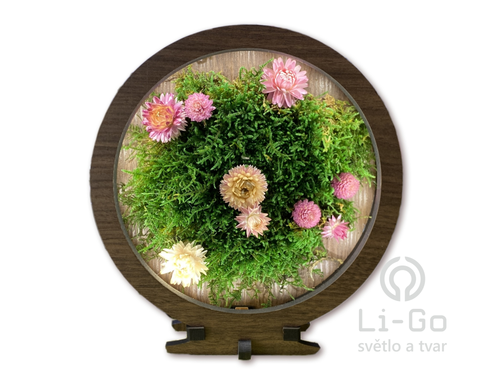 Obrazová LED lampa má podsvícenou vnitřní stěnu. Na lampu je přichycen mech, sušené květiny případně borová kůra a modřínové šišky. Lampa je osazena LED diodami a napájena externím zdrojem napětí na 12V do zásuvky. Součástí svítidla je otočný stmívač a zdroj.