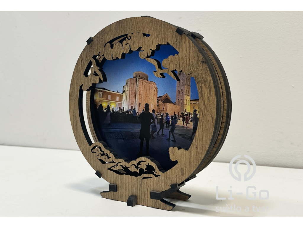 - Varianta bez podsvícení, pouze jedna prožezaná stěna stěna s nožičkou. Fotografie se připevní dřevěnou sponou na zadní stěne rámečku.