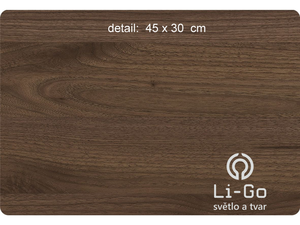 - Ořech má povrch s jemnou strukturou (reliéf) dřeva, polomatný. Tmavý odstín, kresba dřeva příliš nevystupuje, odstín je hnědý včetně suků. Na ořechu příliš nevyniká řezaná (černá) hrana.