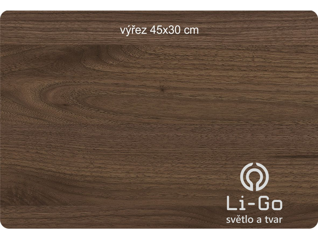 - Ořech má povrch s jemnou strukturou (reliéf) dřeva, polomatný. Tmavý odstín, kresba dřeva příliš nevystupuje, odstín je hnědý včetně suků. Na ořechu příliš nevyniká řezaná (černá) hrana.