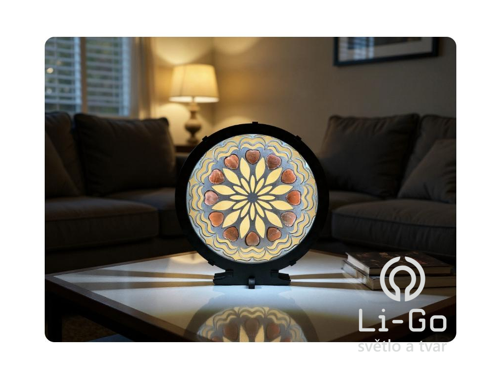 Obrazová LED lampa má podsvícenou přední stěnu. Boky má lampa otevřené a světlo se tak šíří do prostoru a decentně osvětlí interiér. Lampa je osazena LED diodami a napájena externím zdrojem napětí na 12V do zásuvky. Součástí svítidla je otočný stmívač a zdroj.